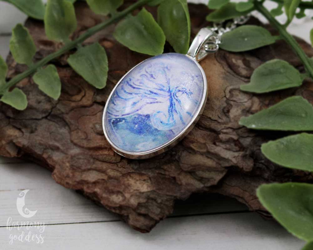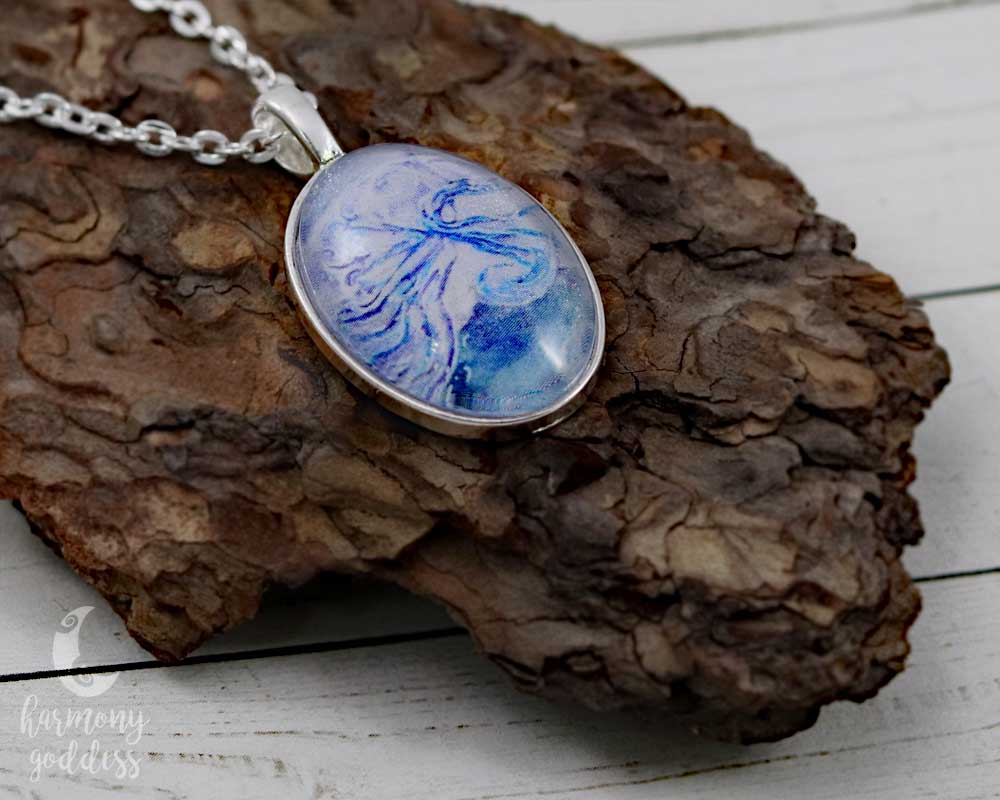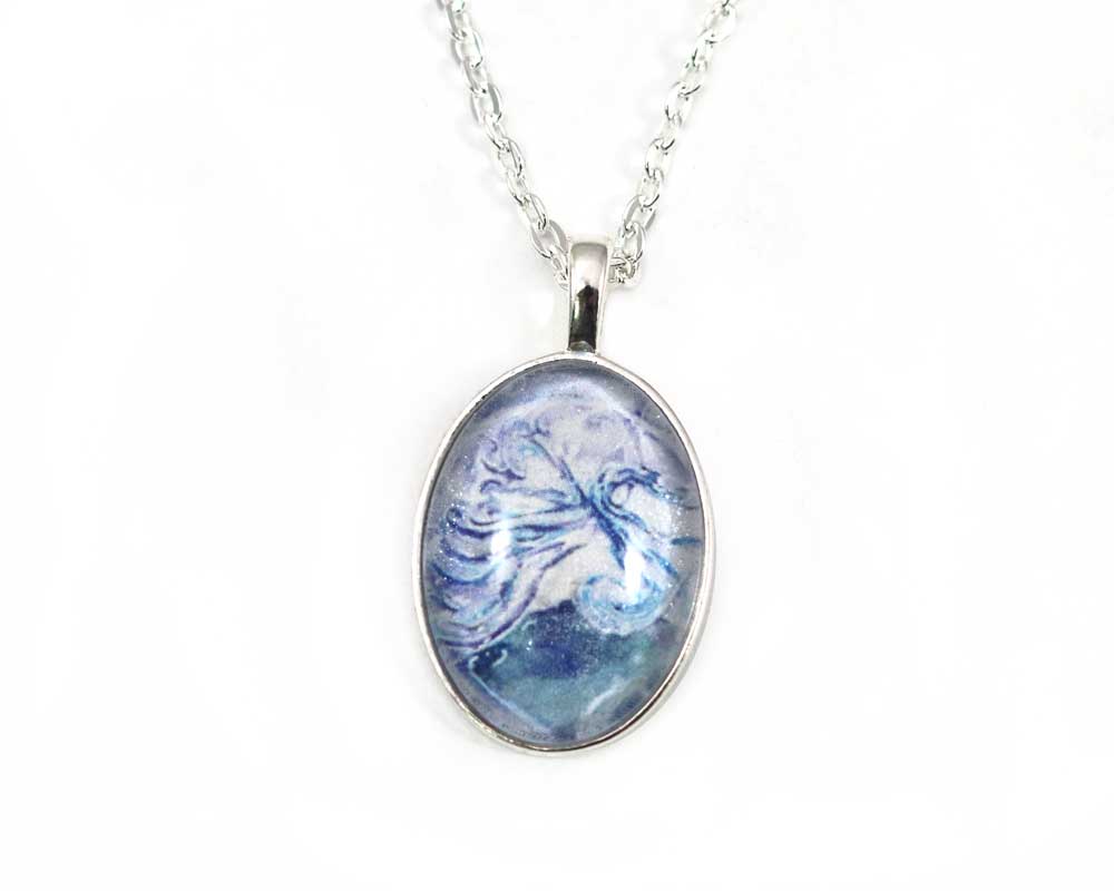 The one accessory that carries the light joyful spirit of faery with you wherever you go. Glittering under glass with flowing wings in shades of blue, the Air Elemental Necklace by Harmony Goddess is a celebration of freedom - the perfect way to express your inner wild child.