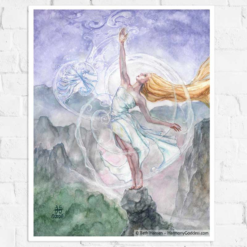This is a fine art photographic reproduction from an original watercolor painting by visionary artist Beth Hansen. Resplendent in shades of lavender, blues and white this print is the final element you need for your magic. The Air Mother draws down all the knowledge from the metaphysical realms
