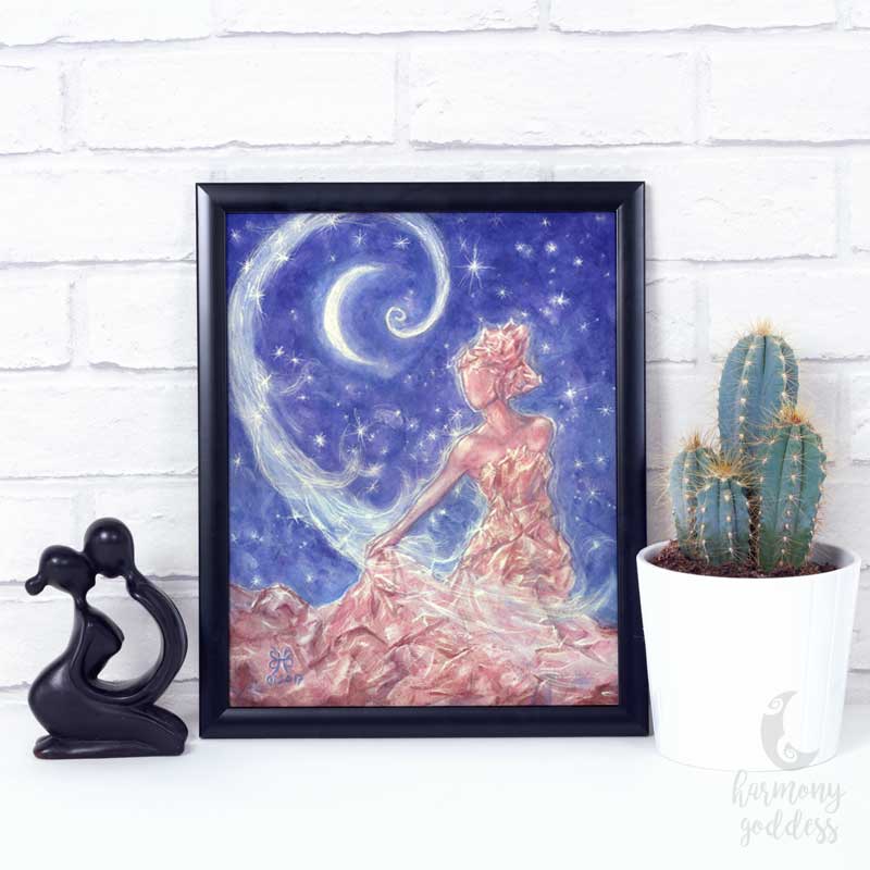 The Crystal Goddess has come to dazzle our eyes. Rose quarts sooths our hearts with love under the light of a crescent moon. She embodies the energy of earth and life, strong, gentle, healing.