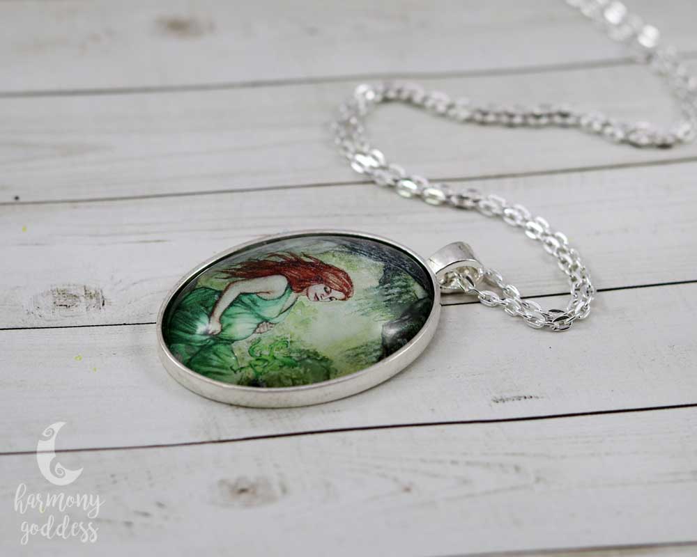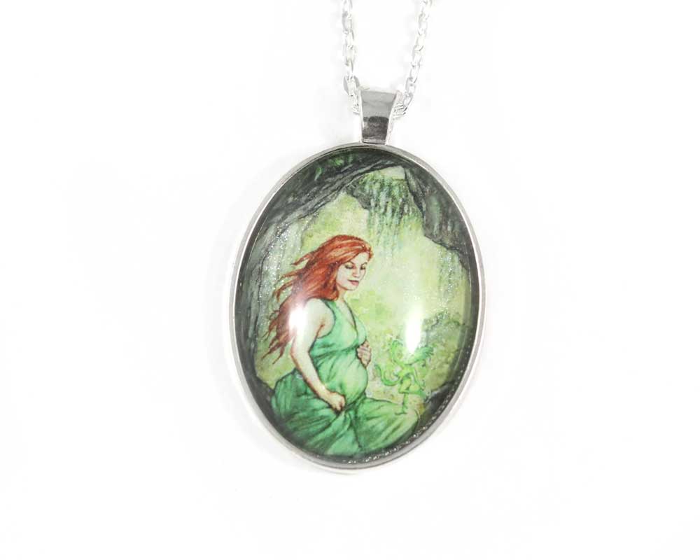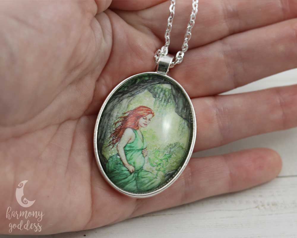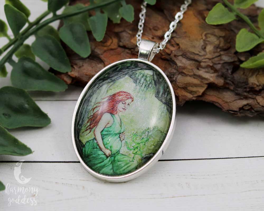 One accessory grounds you and celebrates the day. Glittering under glass with details in shades of green, the Earth Mother Goddess Necklace by Harmony Goddess is a symbol of growth and becoming - the perfect way to express your intention as a nature loving woman.