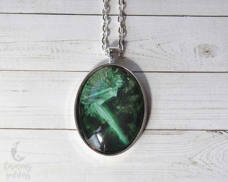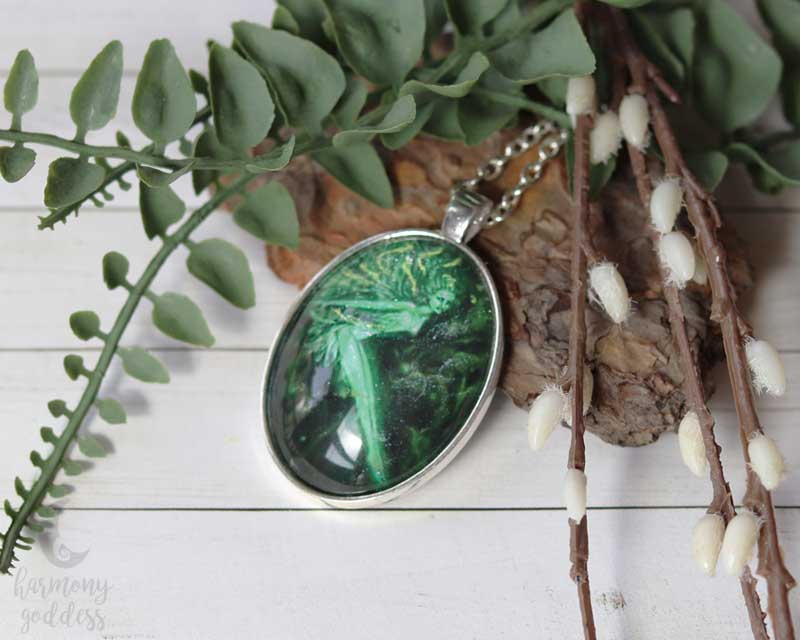 The Faerie of the Green miniature art print is held in a silver plated bezel, and can be paired with a silver plated chain. Each necklace comes to you charged with reiki healing energy, and silver is one of the best conductors out there. That’s why so many people include silver jewelry in their pagan bling, it transmits magick.
