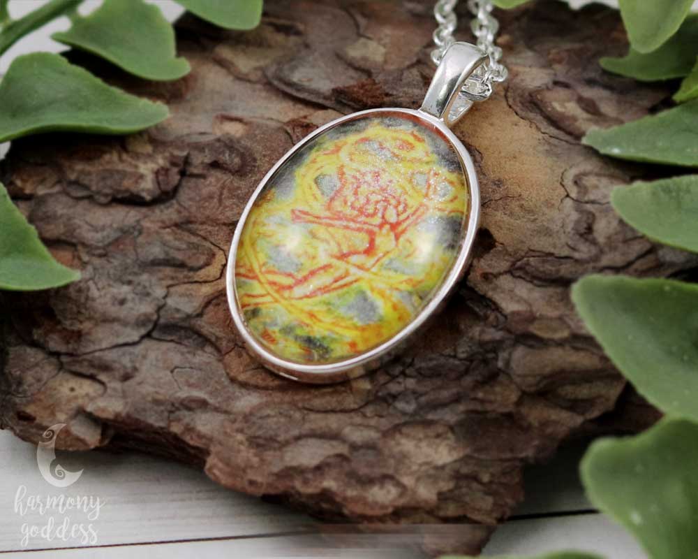The one accessory that ignites the spark of your potential. Glittering under glass in shades of yellow and red, the Fire Elemental Sprite Necklace by Harmony Goddess is a swirling symbol of your charisma - the perfect way to light your inner fire.