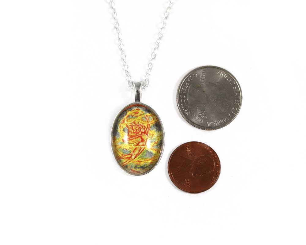 Material: Glass, miniature art print on paper, micro-pearl glitter, glaze, silver plated bezel