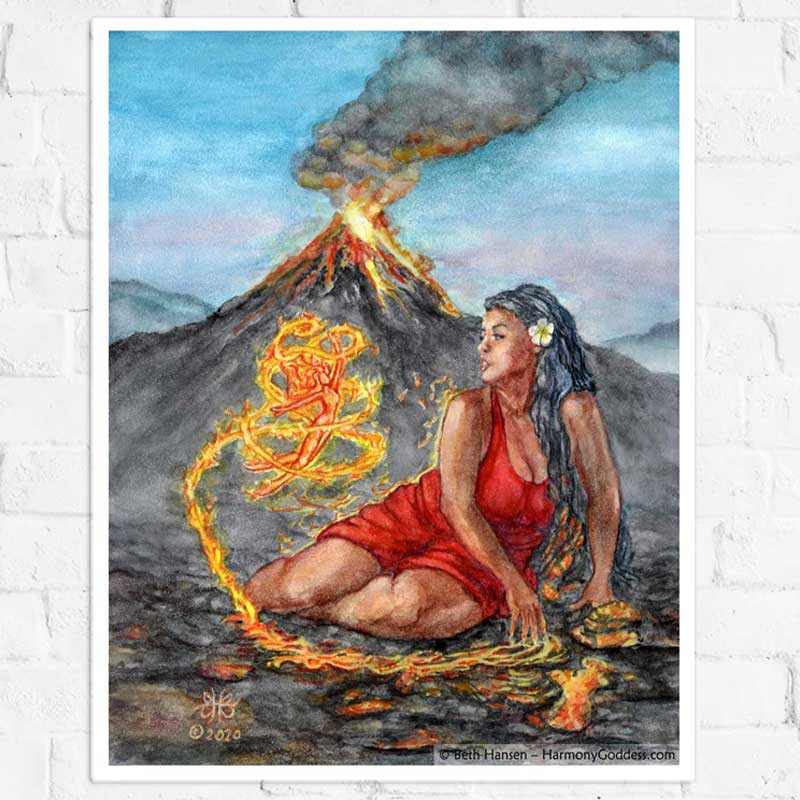 Inspired by the Hawaiian Goddess Pele, his is a fine art photographic reproduction from an original watercolor painting by visionary artist Beth Hansen. Each print is blessed by Beth with Reiki and the power of the Fire Mother Goddess. Intense with shades of red, yellow, and orange; the cool blue sky and shades of gray promise a positive outcome.