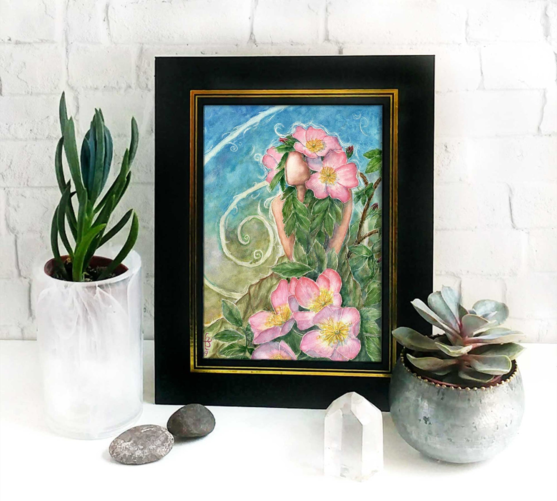 Are you prepared to have wildflower magic in your home? Then get your altar ready to welcome the Prairie Rose Goddess! Elegantly framed in archival black card stock with golden foil accents, this enchanting art print brings a woodland garden in your home.
