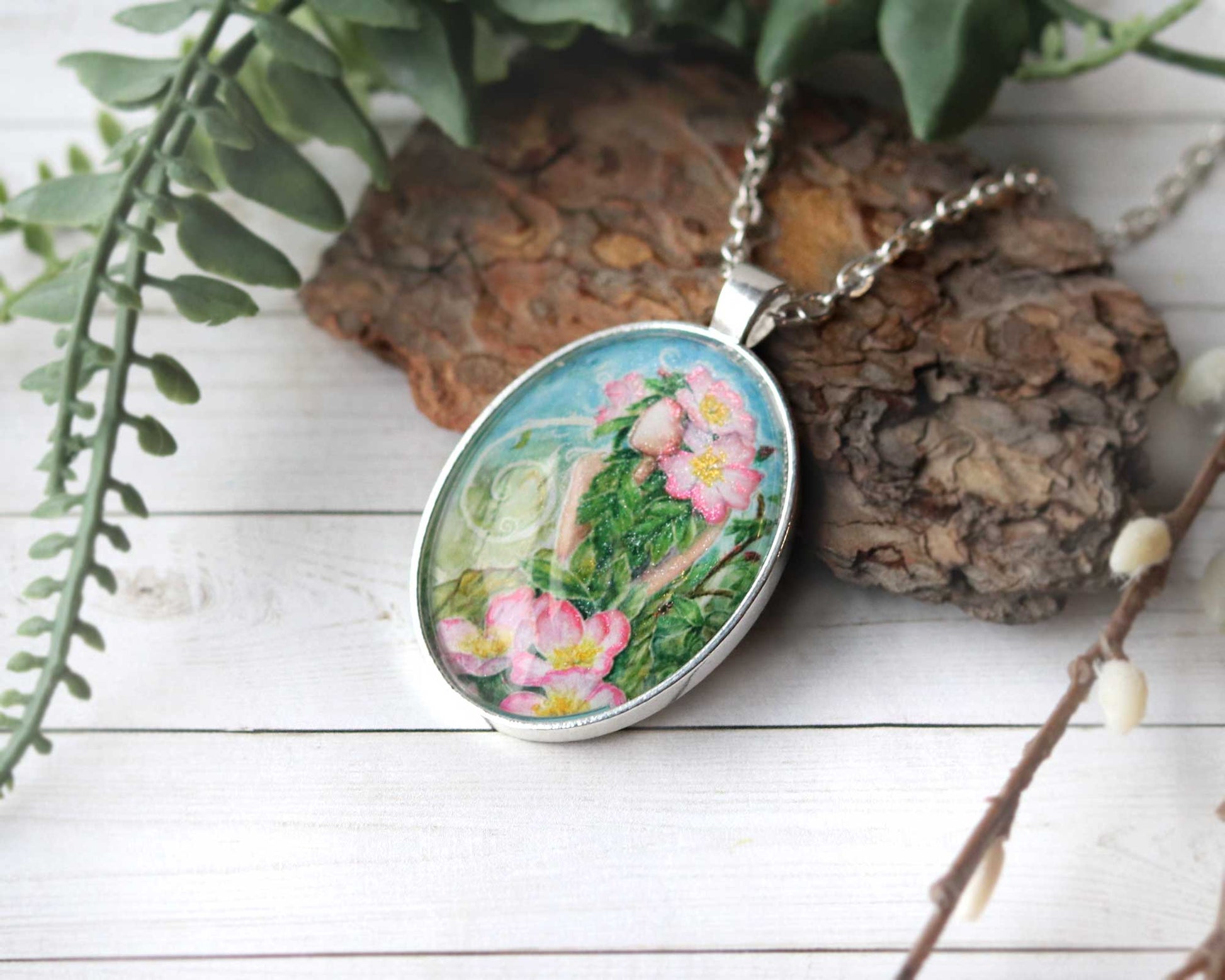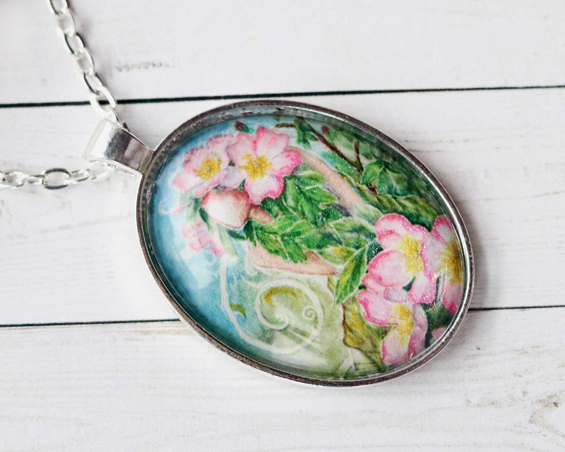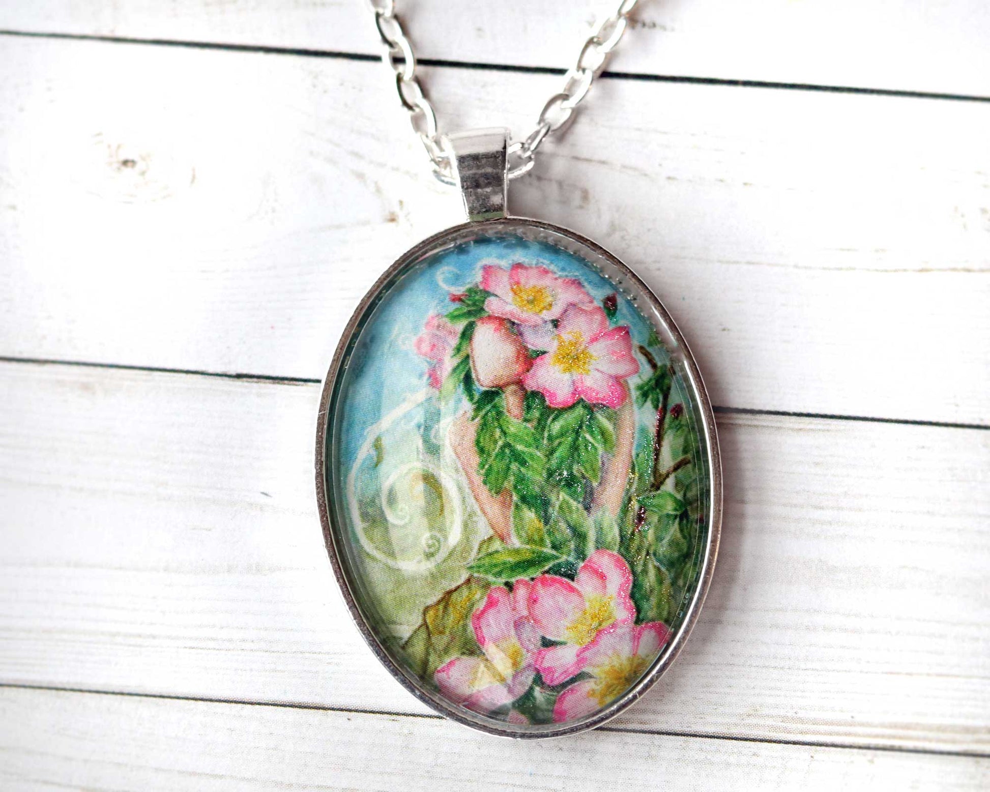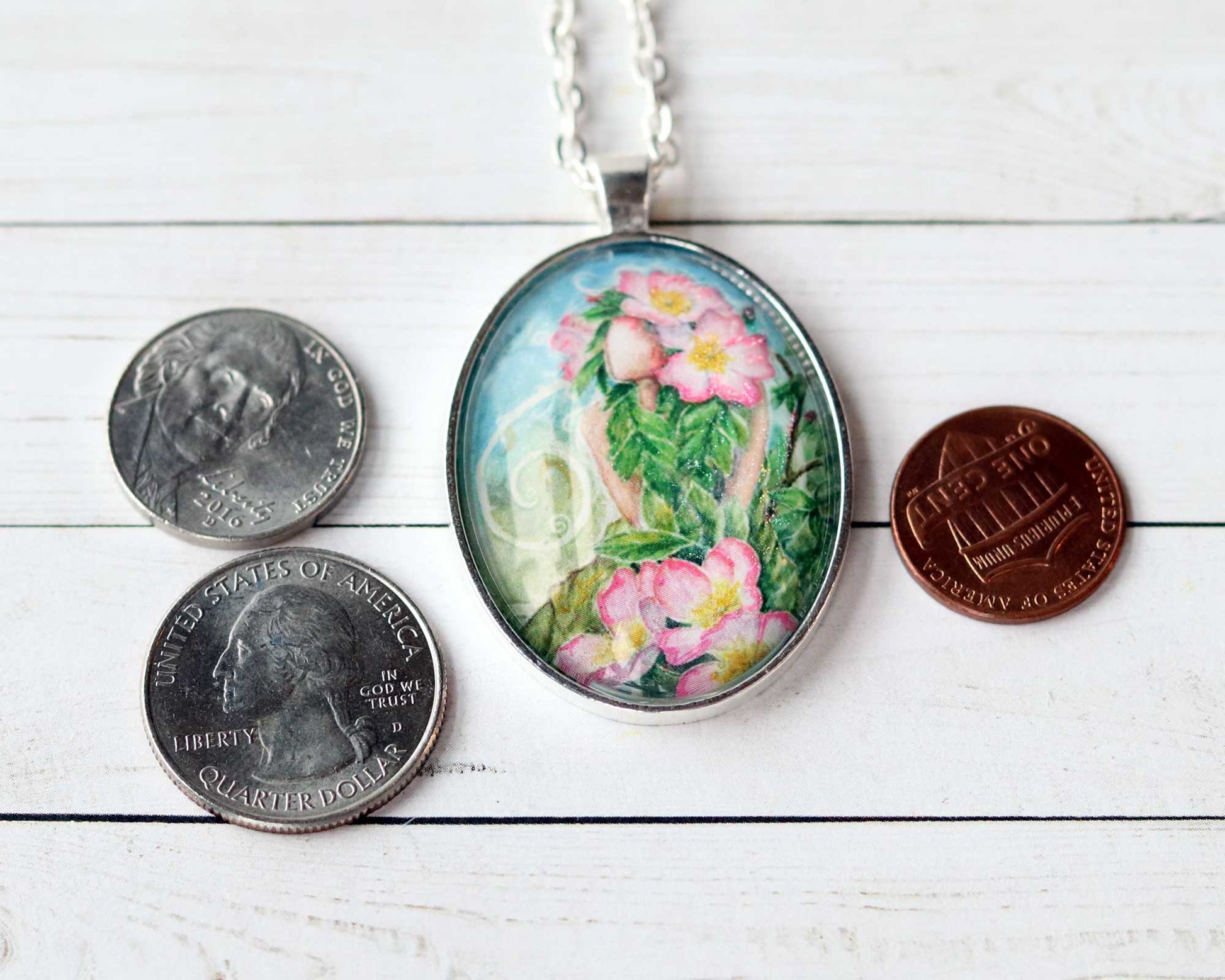 The Prairie Rose Goddess sits under a blue sky in enchanting beauty. Her magic lies in the swirl of growing vines, including the thorns of protection, with flowers as her crown and leaves as her hair. This beautiful pendant features a miniature art print hand tinted with glittering gel inks under a glass cabochon in a silver plated oval bezel. Crafted from an original watercolor painting, this expressive fine art necklace is made with the intention of celebrating the power of the sacred feminine with the awe of the expanse of the prairie.