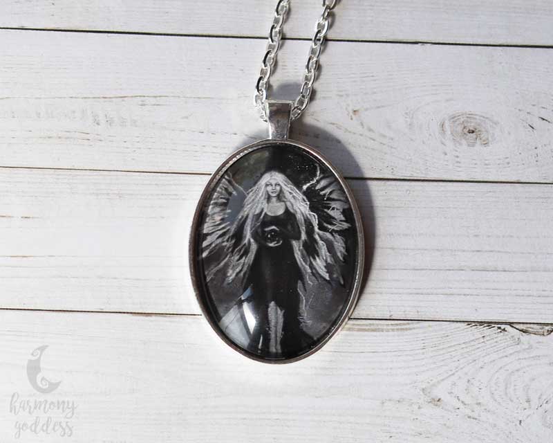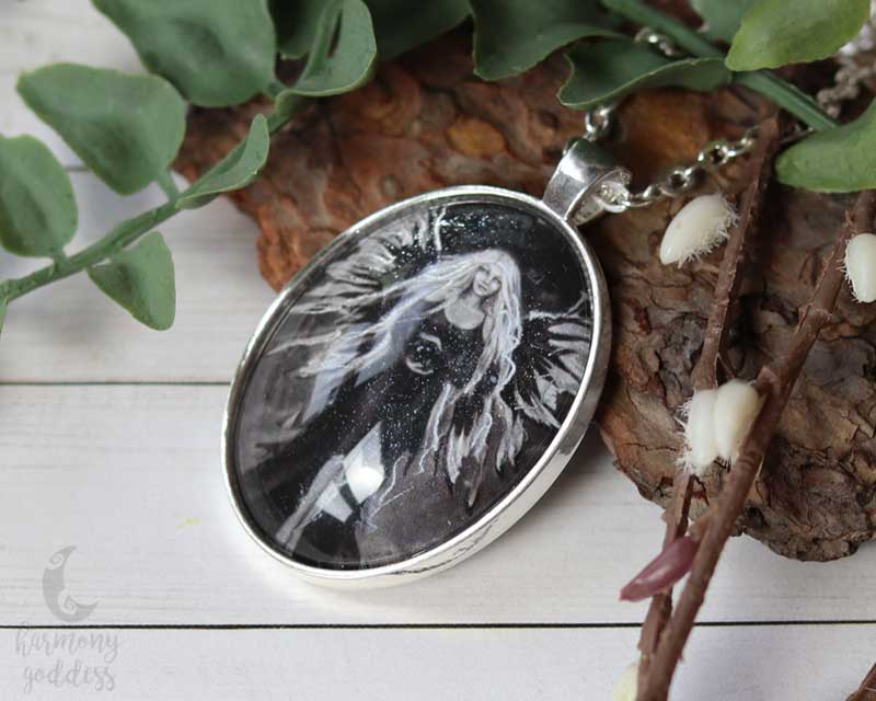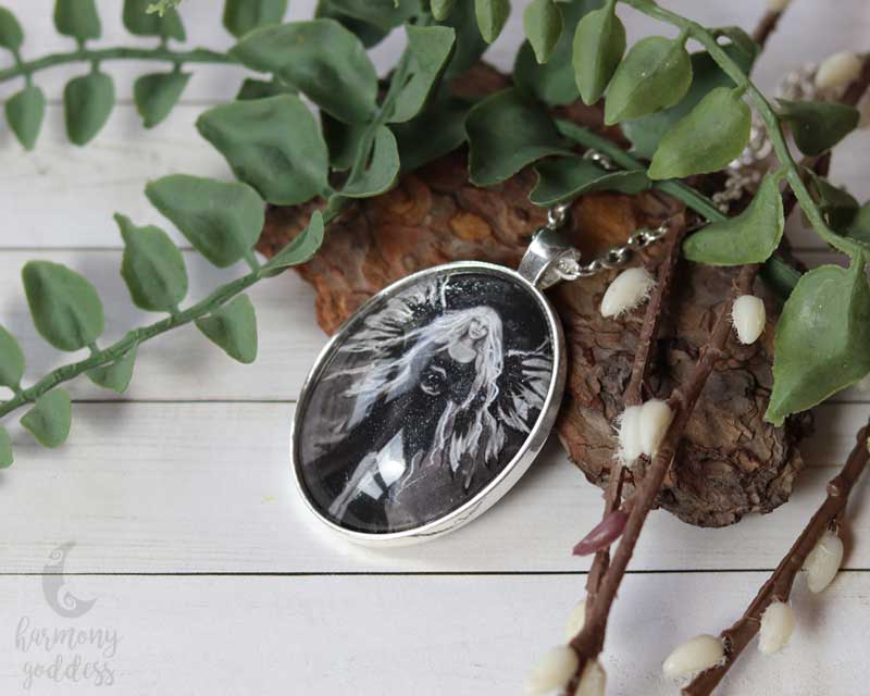 Painted on a Saturday to enhance the power of clarity and craft, the Faerie of Insight is your third eye at work. Both silver and gray are colors associated with the good people, and black represents hidden truth. It is in our hearts that we transform our thoughts into physical action to manifest our desires in the world. Go ahead and welcome this visionary magic into your heart and wear this silver gothic necklace throughout your day. She will surely help you on whatever your quest is.