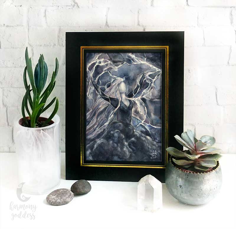 Are you prepared for dramatic transformation? Then get your altar ready to welcome the Storm Goddess! Elegantly framed in archival black card stock with golden foil accents, make this compelling art print the focal point for your most powerful workings.