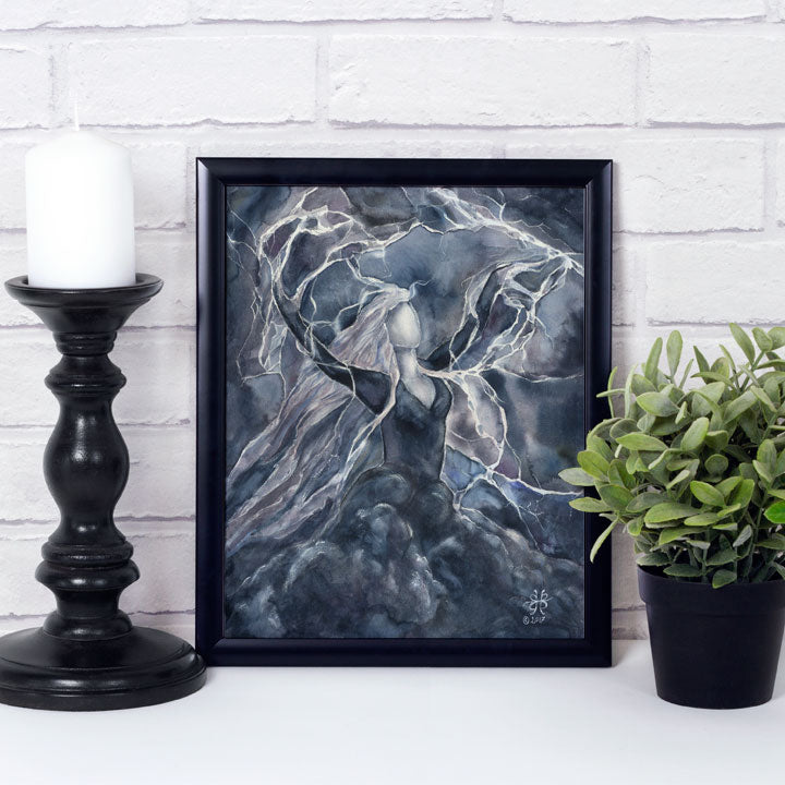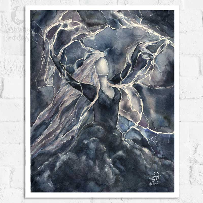 Unpredictable and electrifying, the Storm Goddess has a job to do, both powerful and sacred. Her dress is a rolling thunder while her hands and hair are full of lightening. She brings sweet release to tension and heat, while gifting the earth with rain.