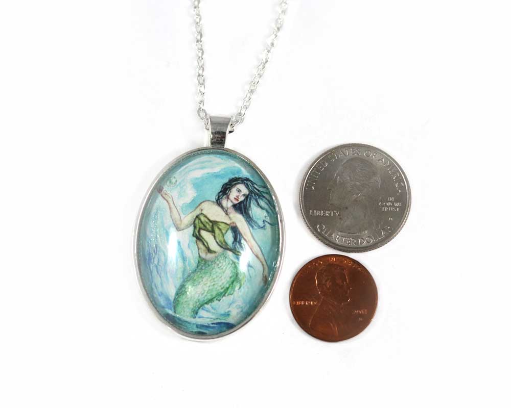 Shimmering with pearlescent glitter, it's a touch of magic as glamorous and beautiful as you are. This empowering pendant cameo has been lovingly crafted by Beth from a miniature art print of her original painting. Mounted in a silver plated bezel under a crystal clear glass cabochon, it has the perfect amount of sparkle and shine to proclaim your watery nature.