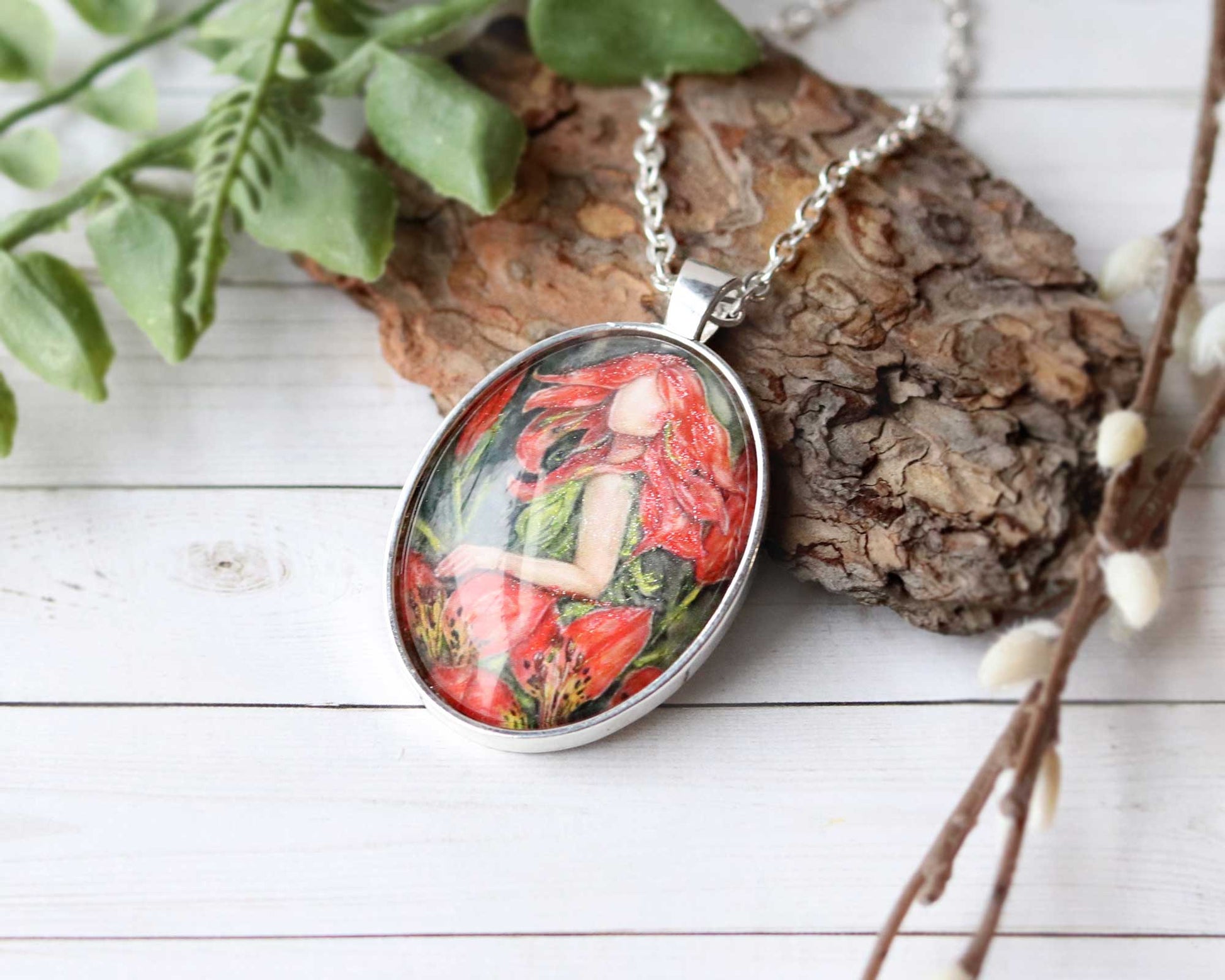 The Wood Lily Goddess blesses the edges of the forest with the deep colors of the setting sun, reminding us that even in darkness there is light. This beautiful pendant features a miniature art print hand tinted with glittering gel inks under a glass cabochon in a silver plated oval bezel. Crafted from an original watercolor painting, this dramatic nature goddess art hand made pendant is made with the intention of celebrating the divine feminine with the joyful wonder of sunlight dancing through the trees.